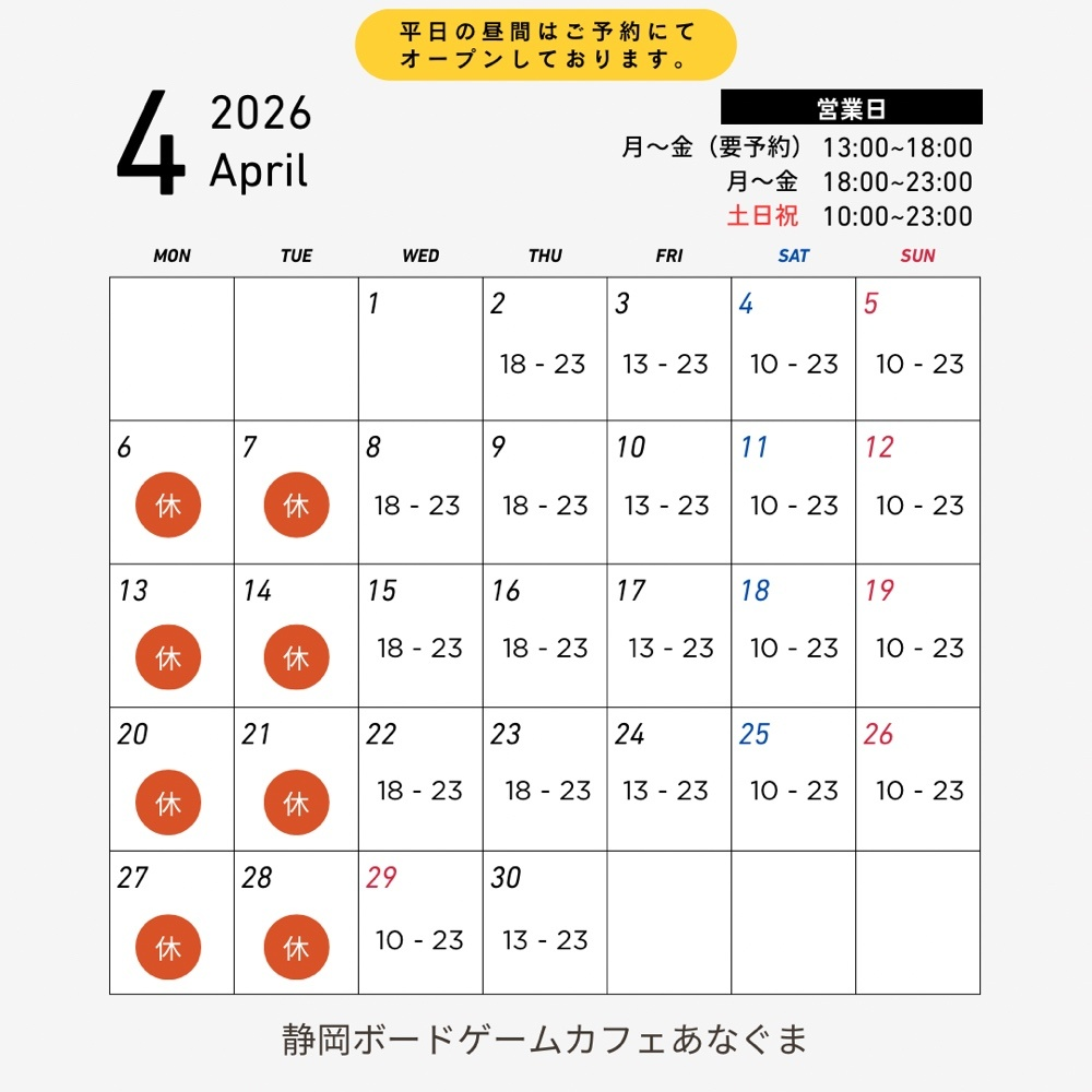 【お知らせ】4月の営業カレンダー公開!春の「ボドゲ始め」はいかがですか?